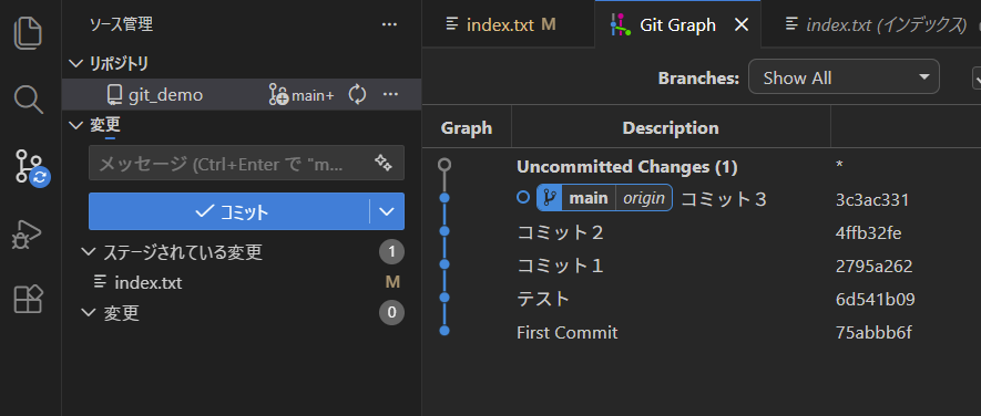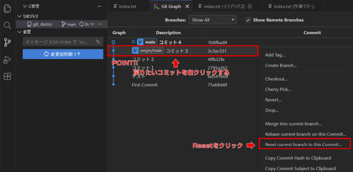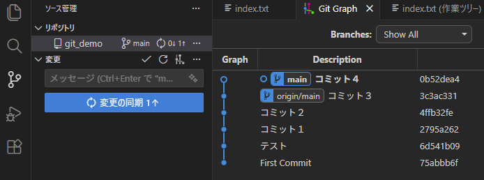 こちらが、誤って「コミット4」をコミットしてしまった状態のVSCode。
