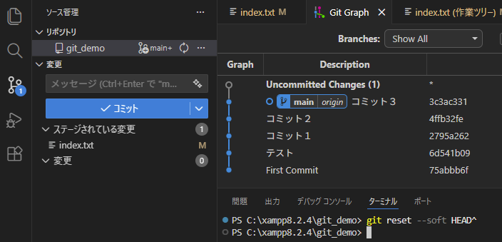git reset --soft HEAD^こちらのコマンドを実行します。