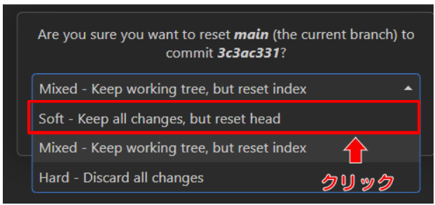 あとは簡単です、ダイアログの「Reset current branch to this Commit」を選んで「Soft」を選ぶだけ。さっそくやってみましょう!