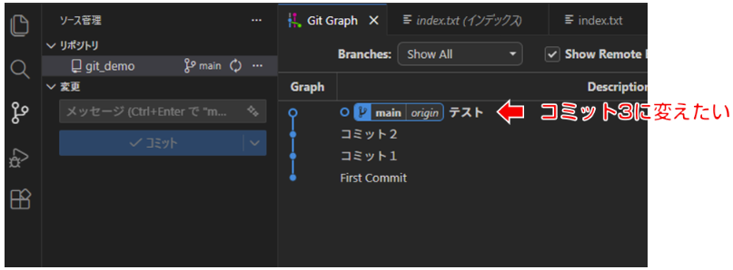 こちらの「テスト」を「コミット3」に変えたいと思います。