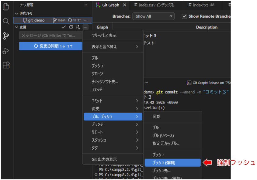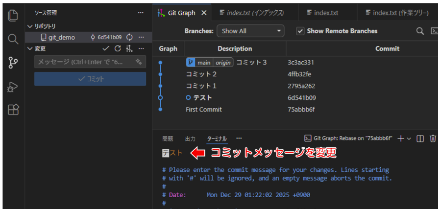 このとおり、VSCodeでコミットメッセージの変更が完了しました。