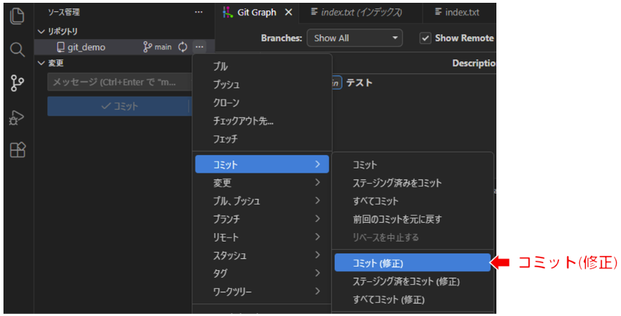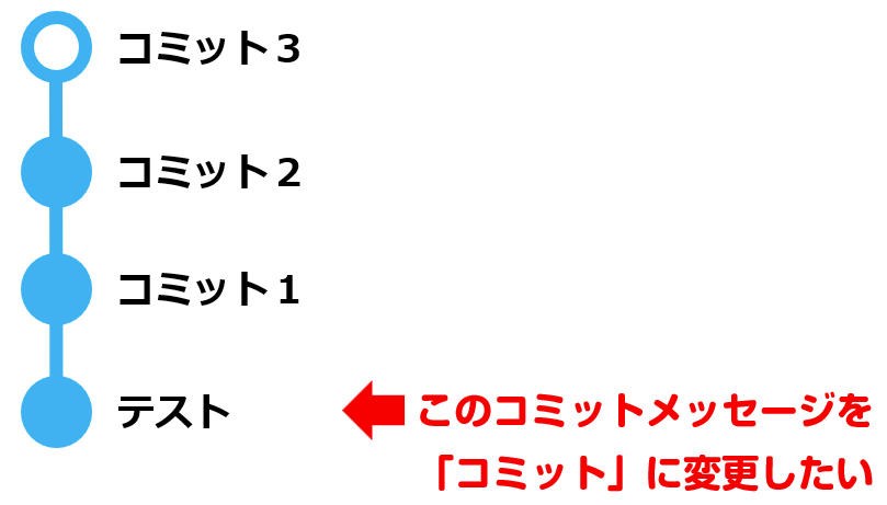 git commit --amend -m "コミット3"このようにコマンドを実行します。