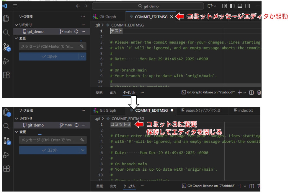 コミットメッセージエディタが開くので、「テスト」を「コミット3」に変更します。