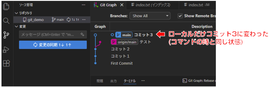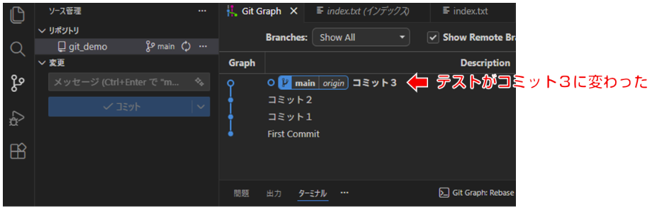 これで、Rebase(reword)によるコミットメッセージの変更が完了しました。