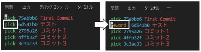 今回は「テスト」コミットを変更したいので「テスト」の行の「pick」を「reword」に変更します。TODOリストでは基本的にコマンドだけを編集して、次のステップで実際の修正を行います。