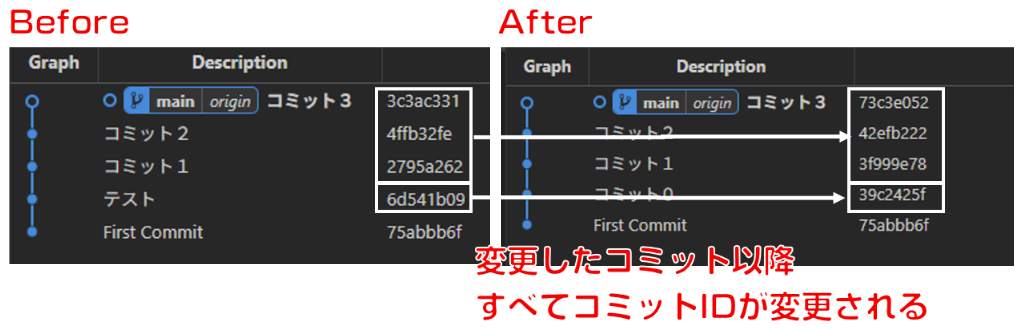 「Amend」「Rebase」を使います。本題に入る前に、これらを実行した後のコミット履歴のイメージをおさらいしておきます。