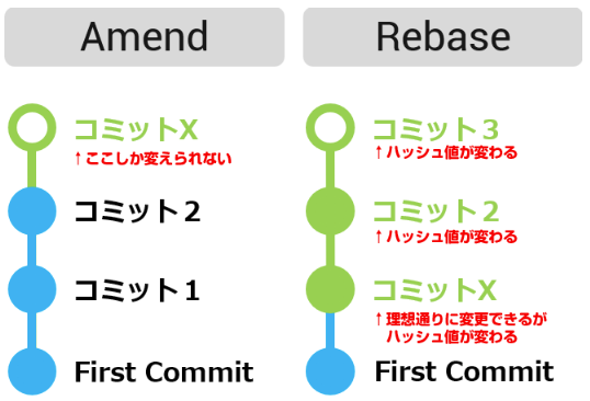 本題に入る前に、「Amend」「Rebase」を実行した後のコミット履歴のイメージをおさらいしておきます。